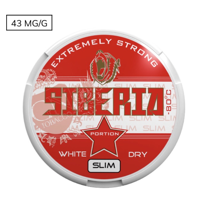 Siberia -80°C Slim 43 mg, piyasadaki en güçlü İsveç nikotin torbalarından biri olarak bilinir. 43 mg/g nikotin içeriği ile birçok güçlü alternatife kıyasla iki kat fazla nikotin sağlar. Bu nedenle, yalnızca deneyimli kullanıcılar için uygundur ve yeni başlayanlara önerilmez.